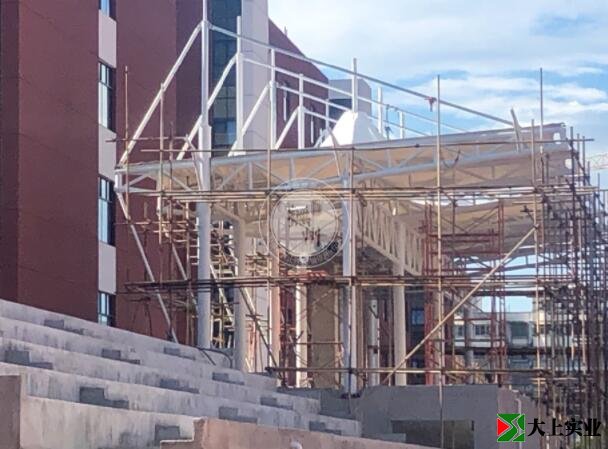 目前運動場看臺主體框架已經(jīng)建成,膜結構頂蓋已經(jīng)就位有工人正在鋼架上作業(yè),看臺兩側的水泥階梯已經(jīng)初具雛形,可以看出整個看臺的大致效果。