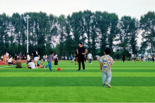 塑膠跑道上,市民們或悠閑散步,或揮汗練跑;綠茵場上,市民們有的在盡興地踢足球,有的則是一家人席地而坐,拍照打卡,歡聲笑語,其樂融融。